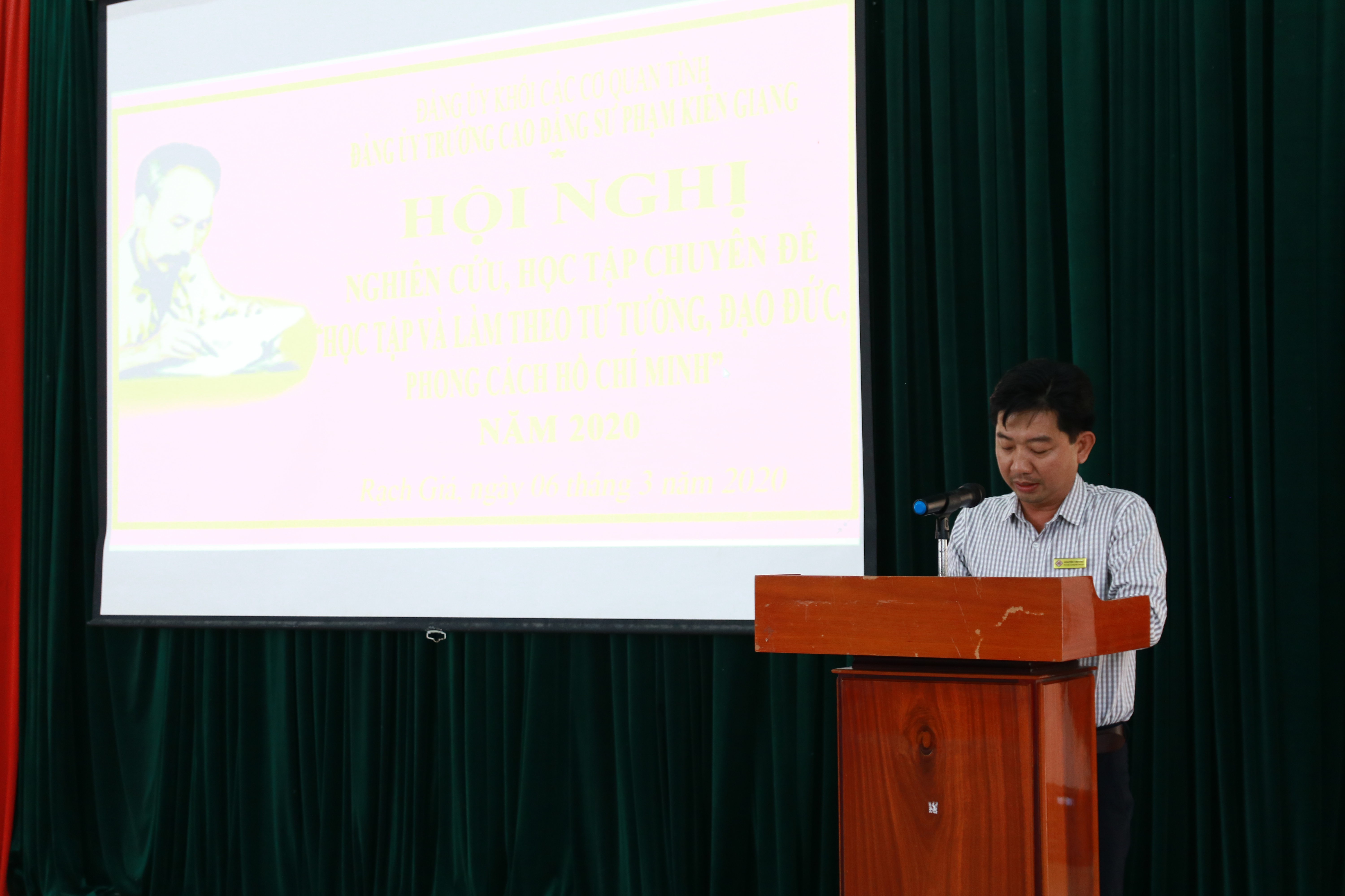 Nhằm tăng cường khối đại đoàn kết toàn dân tộc, xây dựng Đảng và hệ thống chính trị trong sạch, vững mạnh theo tư tưởng, đạo đức, phong cách Hồ Chí Minh, BCH Đảng ủy trường CĐSP Kiên Giang đã tổ chức Hội nghị nghiên cứu, học tập chuyên đề học tập và làm theo tư tưởng, đạo đức, phong cách Hồ Chí Minh năm 2020 tại Giảng đường của nhà trường trong buổi chiều ngày 6/3/2020.