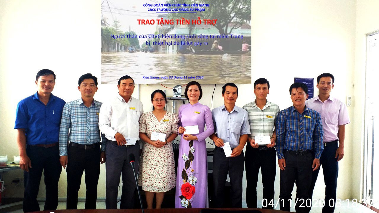Phát huy truyền thống tốt đẹp của dân tộc Việt Nam về tinh thần “tương thân, tương ái”, “nhường cơm sẻ áo”, thể hiện sự quan tâm, chia sẽ, giúp đỡ người gặp hoàn cảnh khó khăn, Công đoàn cơ sở trường Cao đẳng Sư phạm Kiên Giang đã tổ chức kêu gọi cán bộ, viên chức, người lao động trong trường quyên góp ủng hộ người thân của cán bộ, viên chức hiện đang sinh sống tại các tỉnh miền Trung bị thiệt hại bởi các cơn bão và các trận lũ lụt vừa qua.