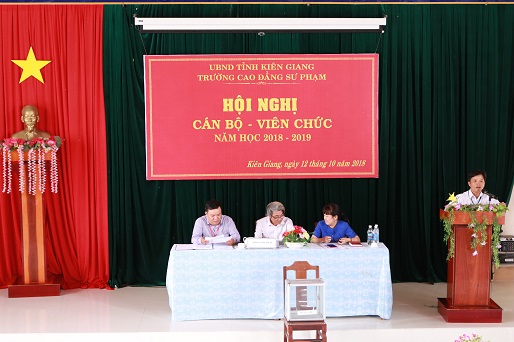 Nhằm đánh giá và tổng kết những kết quả đã đạt được trong năm học 2017-2018 và đề ra phương hướng nhiệm vụ năm học 2018-2019, vào lúc 7h30’ ngày 12 tháng 10 năm 2018, Trường CĐSP Kiên Giang long trọng tổ chức Hội nghị Cán bộ viên chức (CBVC) năm học 2018-2019 với sự tham dự và chủ trì Hội nghị của thầy Hồ Cảnh Phúc - Bí thư Đảng ủy, Hiệu trưởng Nhà trường; ngoài ra còn có sự tham dự của các thầy cô trong Ban Giám hiệu, lãnh đạo các Khoa, Phòng, cùng toàn thể CBVC Nhà trường.