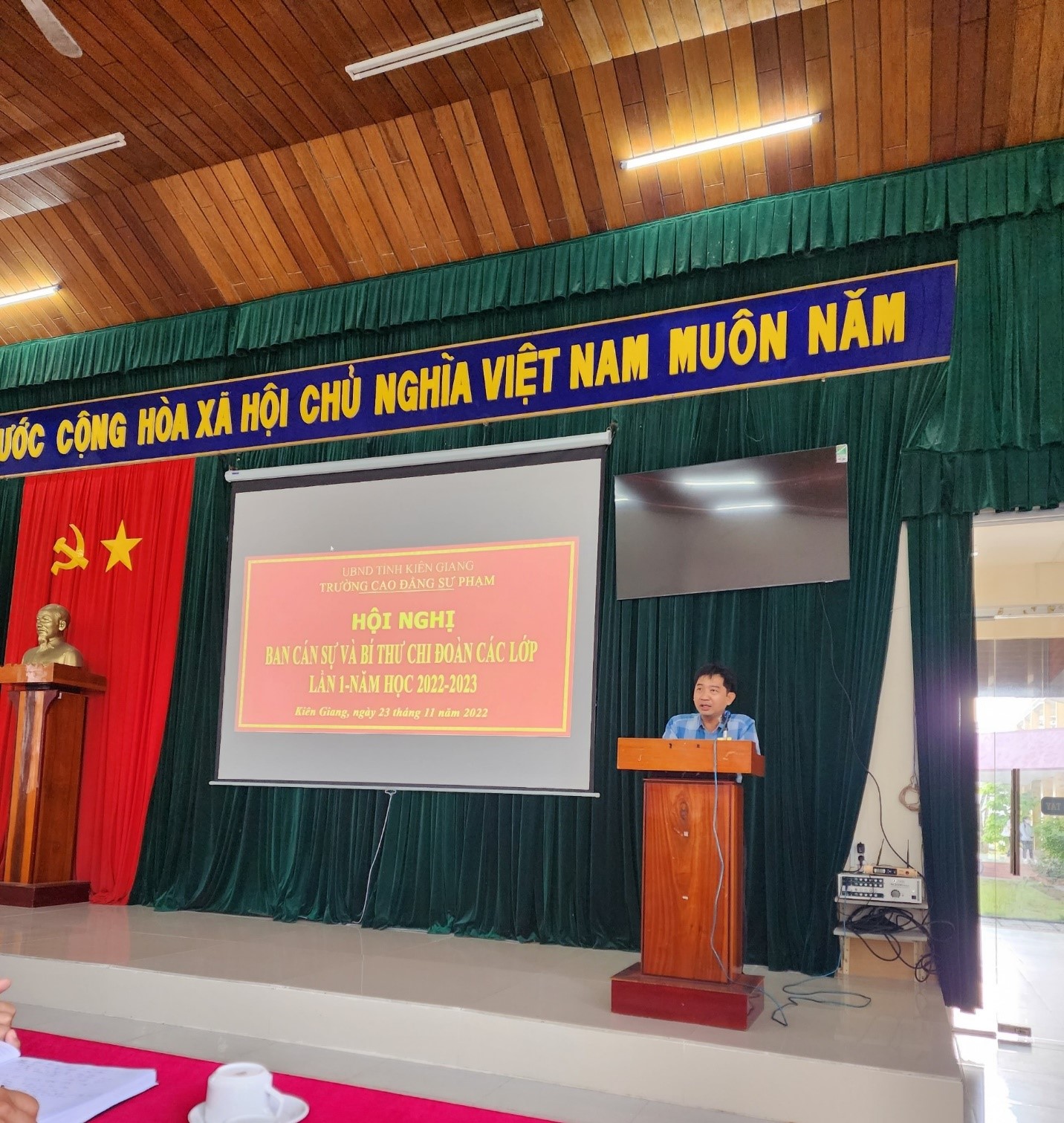 Thực hiện Kế hoạch công tác và Chương trình công tác sinh viên năm học 2022-2023. Sáng ngày 23/11/2022, tại Giảng đường Trường Cao đẳng Sư phạm Kiên Giang đã diễn ra Hội nghị Ban cán sự, Bí thư các lớp Học kì I, năm học 2022-2023. Tham dự Hội nghị có thầy Nguyễn Tấn Kiệt – Phó Bí thư Đảng ủy, Phó Hiệu trưởng nhà trường, các thầy cô lãnh đạo các Phòng, Khoa và đại diện tập thể các lớp sinh viên thuộc các khóa 42, 43, 44.