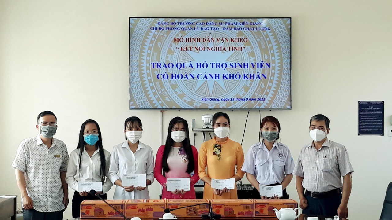 Nối tiếp hoạt động ý nghĩa của mô hình dân vận khéo “Kết nối nghĩa tình”, vào lúc 09 giờ ngày 13 tháng 9 năm 2022 tại phòng họp nhà hiệu bộ trường Cao đẳng Sư phạm Kiên Giang, chi bộ Quản lý đào tạo – Đảm bảo chất lượng đã tổ chức buổi trao quà đợt 02 cho 05 sinh viên có hoàn cảnh khó khăn.