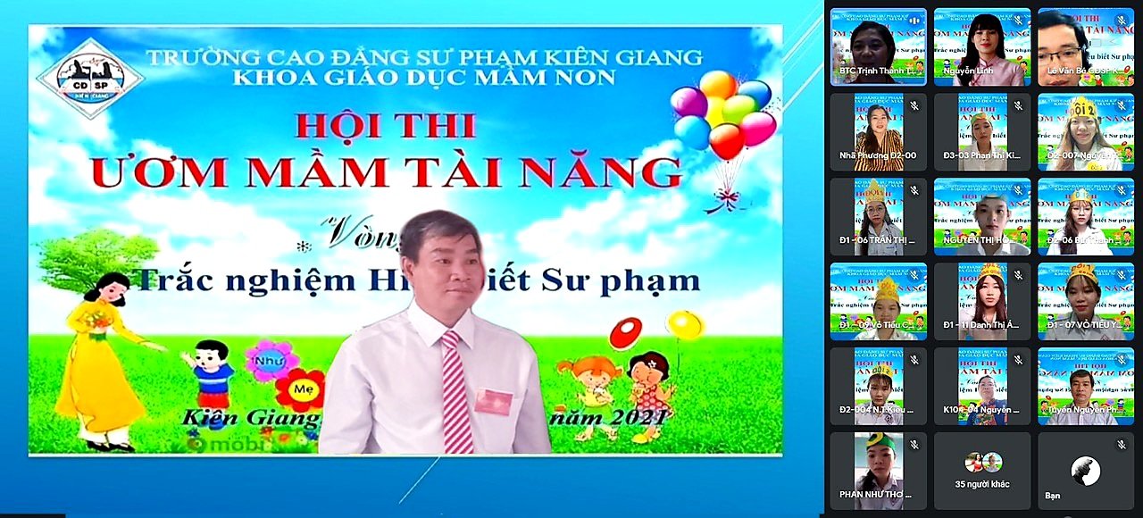 Nhằm đa dạng hoá các hoạt động chuyên môn và xây dựng 1 sân chơi lành mạnh, tạo cơ hội trao đổi chuyên môn giữa thầy – trò và thích nghi với tình hình diễn biến phức tạp của dịch bệnh, Khoa Giáo dục Mầm non – Trường CĐSP Kiên Giang đã tổ chức Hội thi Ươm mầm tài năng năm học 2021 – 2022 trực tuyến dành cho sinh viên ngành Giáo dục Mầm non các khoá. Sáng ngày 27/11/2021, Ban Tổ chức Hội thi đã tổ chức Khai mạc trực tuyến trên nền tảng Google meet.