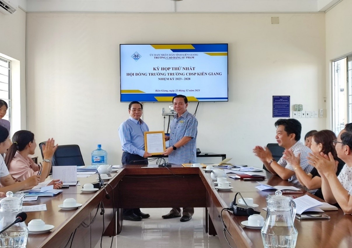 Ngày 22/12/2023, Đảng uỷ trường Cao đẳng Sư phạm công bố Quyết định số 2926/QĐ-UBND ngày 23/11/2023 của Chủ tịch UBND tỉnh Kiên Giang về việc thành lập Hội đồng Trường Cao đẳng Sư phạm Kiên Giang nhiệm kỳ 2023 – 2028, gồm 15 thành viên và Quyết định số 3061/QĐ-UBND ngày 01/12/2023 về việc bổ nhiệm ông Nguyễn Phùng Tuyển giữ chức vụ Chủ tịch Hội đồng Trường Cao đẳng Sư phạm Kiên Giang nhiệm kỳ 2023 – 2028.