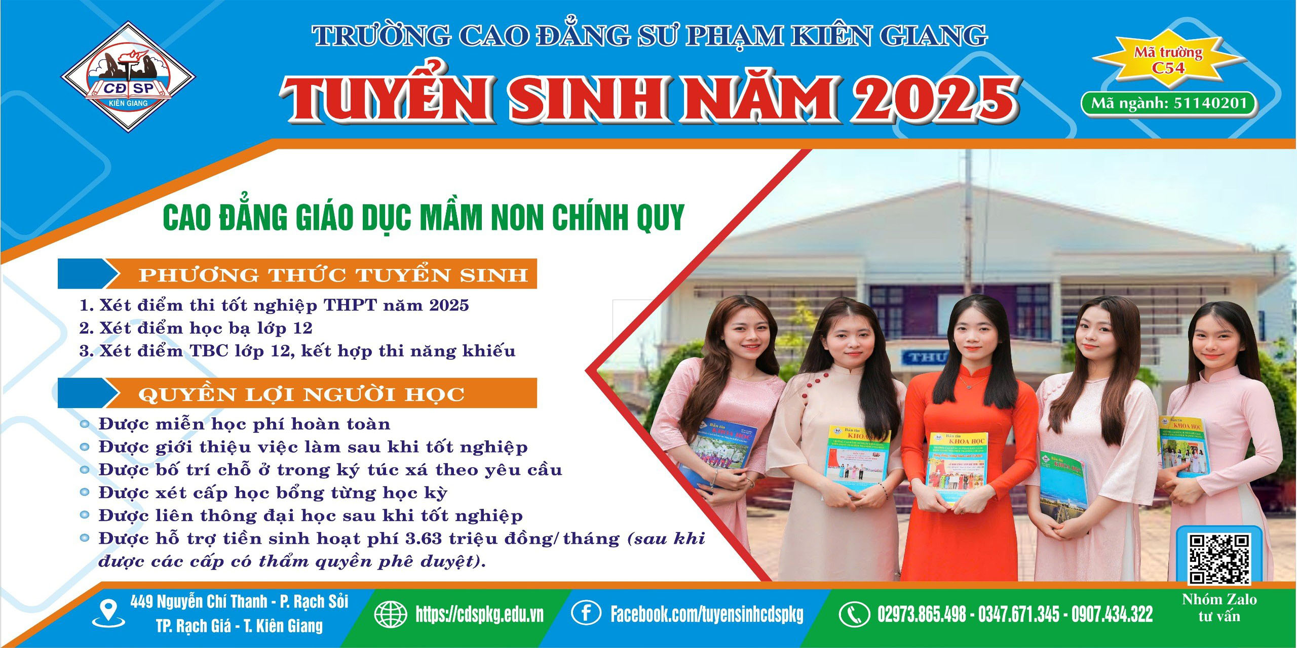 Thực hiện chỉ tiêu tuyển sinh năm học 2025 – 2026, Trường Cao đẳng Sư phạm Kiên Giang tiếp tục nhận hồ sơ đăng ký xét tuyển như sau: